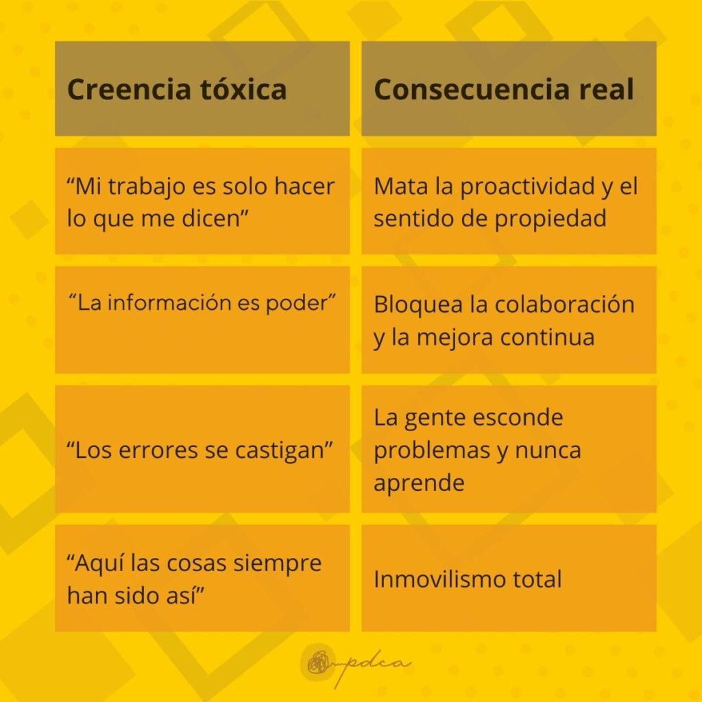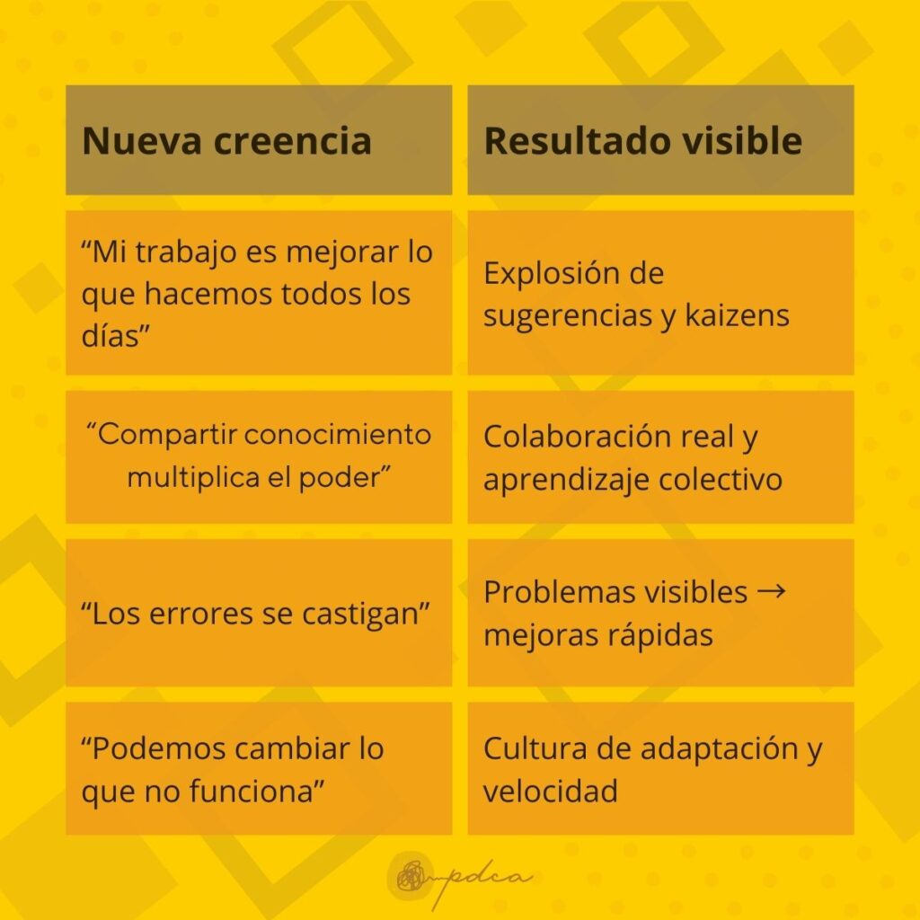 En las empresas que sí logran transformación sostenida (y que mantienen resultados con Pensamiento Lean después de 3, 5 y hasta 10 años), esas creencias tóxicas desaparecen y son reemplazadas por otras completamente distintas. Cuando estas nuevas creencias se instalan, la energía cambia por completo: la gente deja de “cumplir” y empieza a “mejorar”; deja de esconder problemas y empieza a celebrarlos; deja de esperar órdenes y empieza a tomar iniciativa.