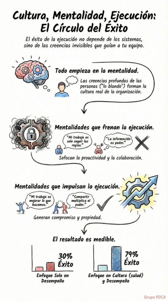 Mentalidad → define la Cultura real Cultura → habilita o bloquea la Ejecución Ejecución → genera Resultados Resultados → refuerzan la Mentalidad original